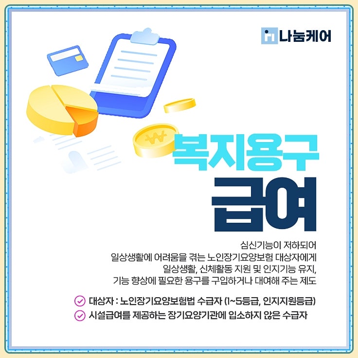 요양원 입소 전, 복지용구 급여로 필요한 물품을 미리 준비하세요 2025년11월11일요양원 입소 전, 복지용구 급여로 필요한 물품을 미리 준비하세요 노년기에는 신체 기능이 저하되어 일상생활을 스스로 하기 어려운 경우가 많습니다. 이럴 때 도움이 되는 제도가 바로 복지용구 급여제도입니다. 복지용구 급여는 장기요양보험에 가입된 어르신 중, 일상생활의 불편을 겪는 수급자에게 신체 활동 지원과 인지 기능 유지에 필요한 각종 용구를 구입하거나 대여할 수 있도록 지원하는 제도입니다. 쉽게 말해, 어르신이 보다 안전하고 편안한 일상을 보낼 수 있도록 필요한 물품을 국가가 지원해주는 복지 서비스입니다. # 복지용구 급여로 이용할 수 있는 품목 복지용구 급여는 크게 구입 품목과 대여 품목으로 나뉩니다. 구입 가능한 품목은 이동변기, 성인용 보행기, 목욕의자, 안전손잡이, 미끄럼방지용품, 간이변기, 지팡이, 욕창예방방석, 자세변환 용구, 요실금팬티 등 총 10가지가 있습니다. 대여 품목은 수동휠체어, 전동침대, 수동침대, 목욕리프트, 이동욕조, 배회감지기 등 6가지이며, 이 외에도 욕창예방 매트리스와 경사로(실내용·실외용)는 구입 또는 대여가 모두 가능합니다. 복지용구 급여는 단순히 편의 물품을 지원하는 것이 아니라, 낙상 사고를 예방하고, 신체 부담을 줄이며, 가족의 돌봄 부담까지 덜어주는 실질적인 도움이 됩니다. 특히 거동이 불편하거나 장시간 침상 생활이 필요한 어르신이라면 이동보조기구나 욕창예방 제품을 활용해 안전하고 위생적인 생활 환경을 유지할 수 있습니다. # 요양원 입소 전 복지용구 활용하기 요양원 입소를 앞두고 있다면, 입소 전 복지용구를 어떻게 이용해야 하는지 알아두는 것이 중요합니다. 요양원에 입소하게 되면 장기요양 등급이 ‘시설급여’로 변경되어, 복지용구 급여제도를 통한 구입이나 대여 이용이 제한됩니다. 즉, 시설에 입소하면 요양원에서 제공하는 물품을 사용하게 되기 때문에, 그 전에 필요한 복지용구를 미리 구매하거나 대여해 두는 것이 좋습니다.