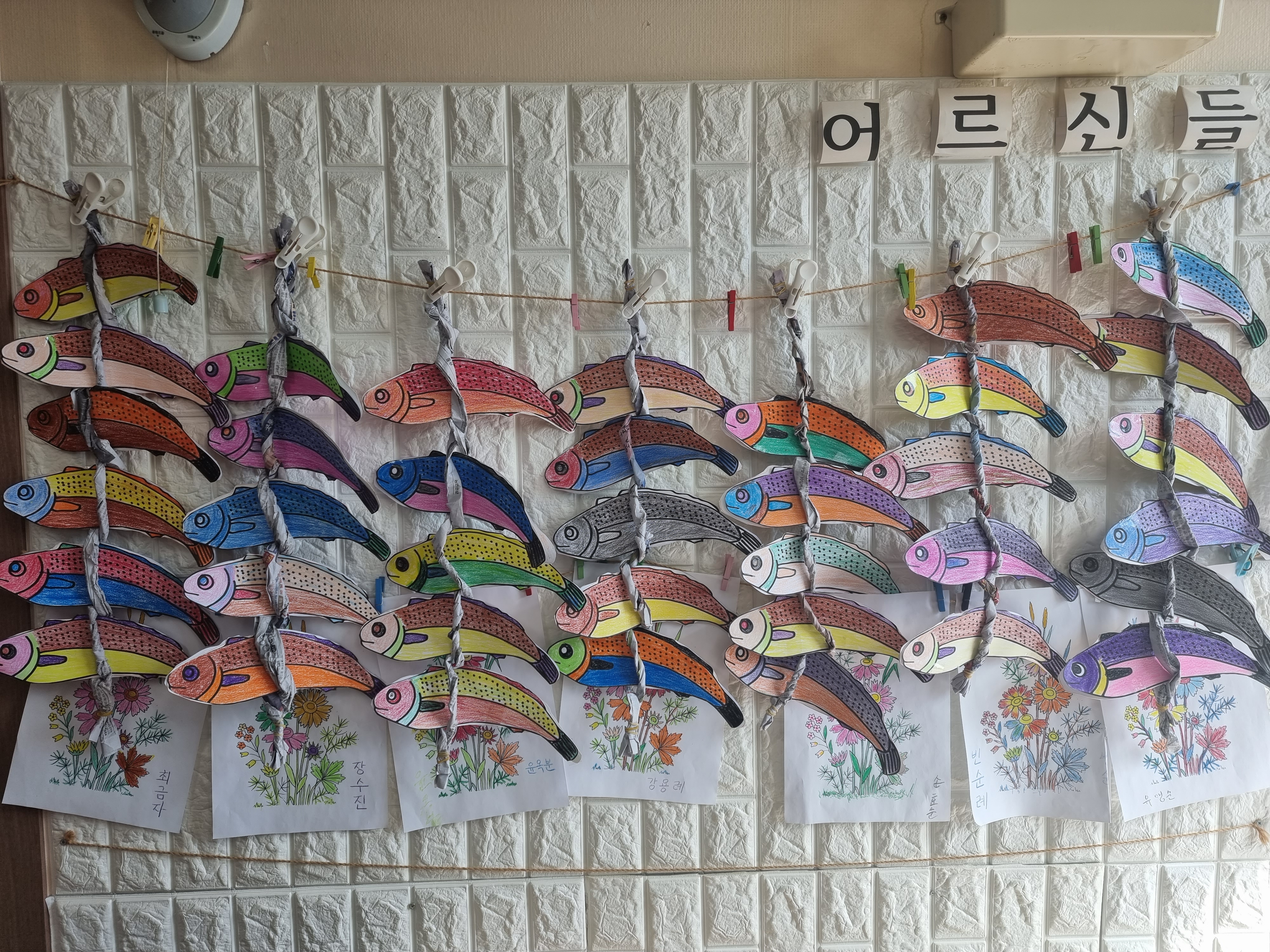 짜잔~~ 작품이 완성 되었습니다 ~!! 어르신들께서 열심히 색칠하셨던 굴비를 엮어서 매달아 놓으니 정말 예쁘죠??