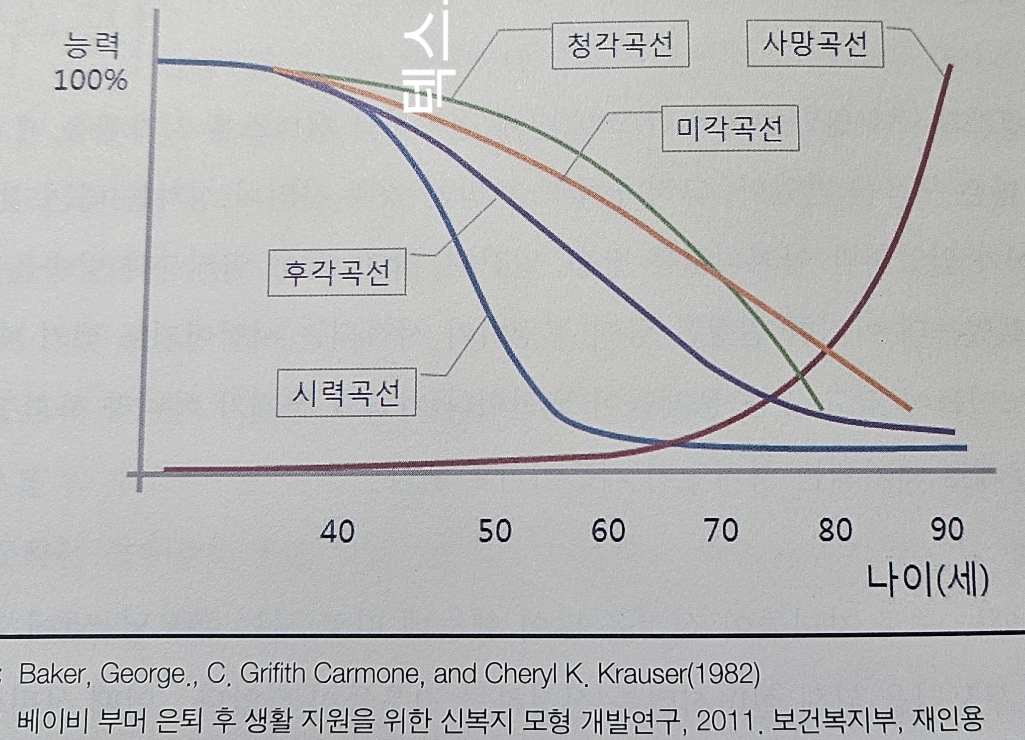 자료내 그래프를 보면 40대 후반을 기준으로 감각기능이 저하되고 , 60대이후 급격하게 저하 되는 것을 볼수 있다. 사망 곡선의 경우는 70대를 기점으로 급격하게 상승하고 있다. 결국 그래프 에서 보이는 것과 같이 노화시기에는 급격하게 기능이 저하되고 있고 이시기를 기점으로 기능저하 이전의 삶의 질을 유지하기 위해서는 필요로 하는 서비스들이 증가하게 된다. 이러한 욕구와 함께 서비스들의 증가가 이루어지지 않으면 건강할 때 유지되어 왔던 생활의 기준이 흔들리게 되고, 생활인 으로의 기본적인 생활이 이루어 지지 않는다고 보아야 한다.