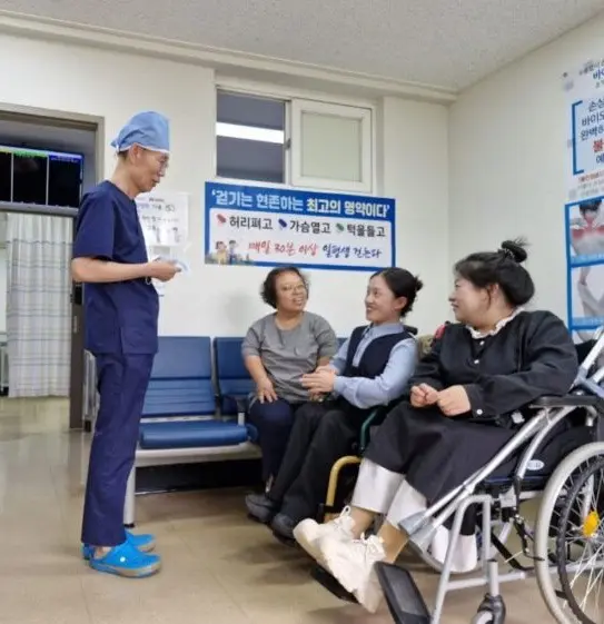 이의상 병원장이 여수애양병원에서 수술을 받은 뒤 감사 인사를 하러 온 저우카이펑(오른쪽 가운데)과 이야기를 나누고 있다. 사진=여수애양병원