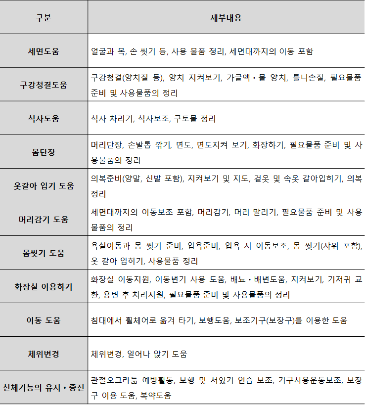 식사도움, 구강관리, 세면도움, 체위변경, 목욕도움, 몸단장, 신체기능의 유지증진